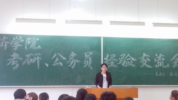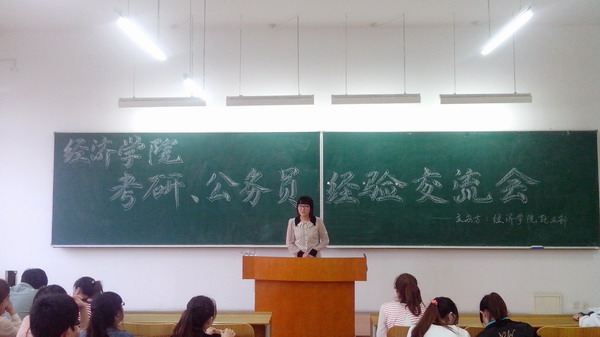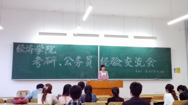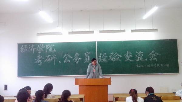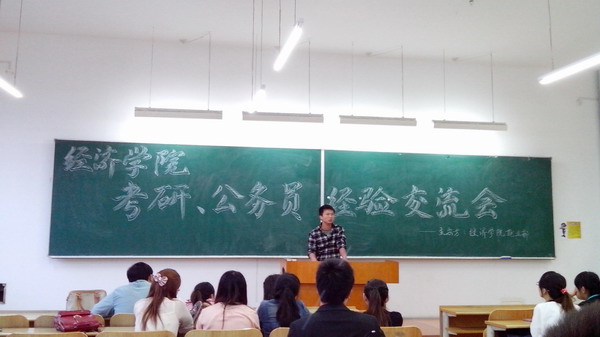 为了加强学生对考研、就业知识的了解,增强学生的考研、就业意识,深入促进学风建设, 2013年5月27日下午五点,经济学院2013年“考研、公务员经验交流会”讲座在4103室顺利召开。经济学院09级考取研究生、公务员代表以及10、11、12级同学参与了此次大会。