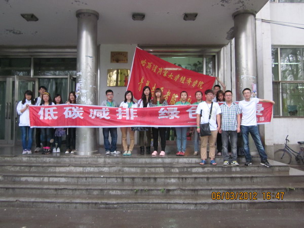 2012年6月4日,经济学院在世界环境日来临之际,在C区食堂门口成功举办“营造绿色城市,呵护地球家园”主题活动。此次活动由经济学院团委青年志愿者部和外联部主办,以树立同学们的环保意识,提醒他们规范自己的行为做一个文明的大学生。