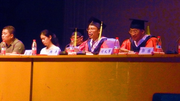 紧接着,韩平书记致辞,他鼓励毕业生在走向社会以后要做一个顶天立地的商大人,不仅专业水平达到要求,更要追求高尚的人格,孝敬父母、关爱他人。韩书记的讲话语重心长,他还希望毕业生在离校之际对学院发展献计献策,多提宝贵意见,并祝愿师生之情长存。毕业生代表徐龙芝的发言充满了对母校的依依惜别之情,她代表毕业生向母校承诺,一定铭记“求真至善 修德允能”的校训,不忘师恩、不忘母校,带着在商大的所学奔向社会,奔向美好的明天。最后,全体起立,伴随着《诚信歌》响起,经济学院2012届毕业生奔赴祖国各地建功立业,为校争光!