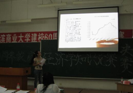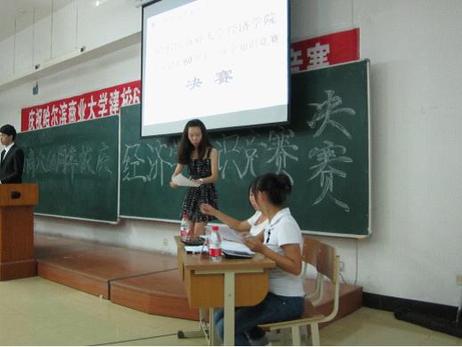 由哈尔滨商业大学经济学院承办的“庆祝建校60周年经济学知识竞赛”决赛于2012年9月1日晚在主楼4206教室圆满落下帏幕。决赛获奖队伍共5支,经济学院研究生代表队(参赛队员高龙、王秋颖)以总分217分的优异成绩荣膺本次竞赛一等奖;经济金融联合代表队(周海港、廖静茹、朱彦仪)以总分166.7分获得二等奖;获得三等奖的3支参赛队伍分别是金融学院本科生代表队(马艳欢、王锦利、张珊)、财政学院研究生代表队(杨忠婷、肖双琼、李姗姗)、经济学院本科代表队(王妍、陈欣园、李超)。