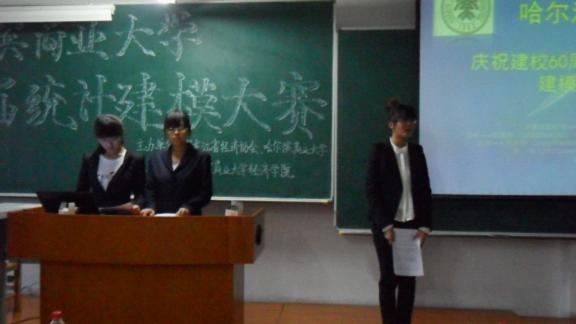 2012年8月31日18:00,哈尔滨商业大学第一届统计建模大赛决赛在0310教室顺利结束,与此同时,此次 “庆建校60华诞 促师生知识创新应用”的主题活动也圆满落下帷幕。比赛邀请到了哈尔滨商业大学实践教学管理中心主任张莉教授、研究生学院副院长王巍教授、经济学院副院长王涛教授、经济学院统计学教研室主任张恩英老师、统计学教研室副主任田秀杰老师作为本次比赛的嘉宾评委,在领导老师的支持和带领下,得到了全校师生的热切关注,也激发了全校师生参与的热情!