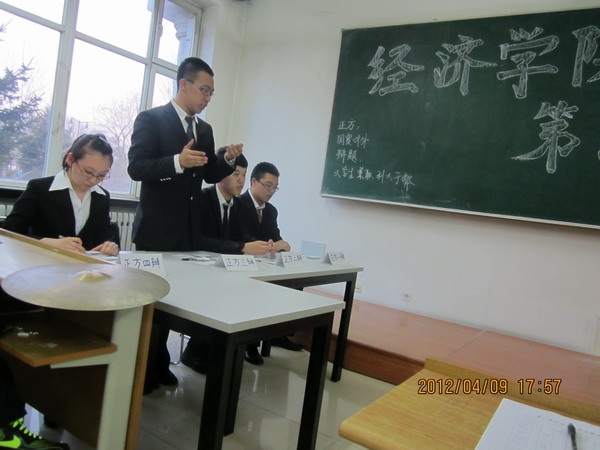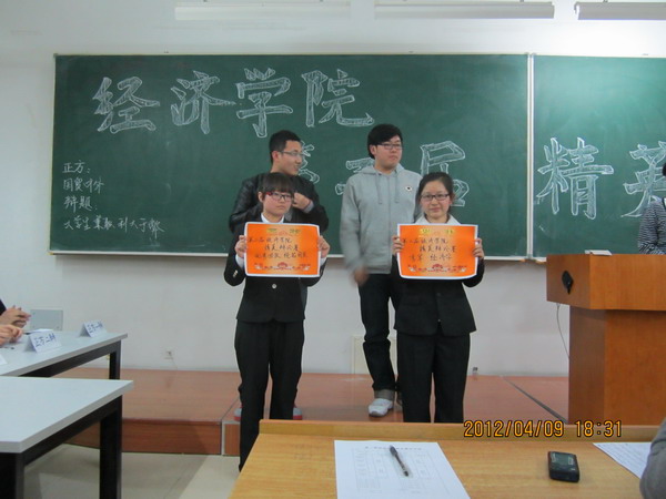 为丰富同学们课余生活,活跃校园文化气氛,体现大学生朝气蓬勃、积极向上的精神状态,培养发掘辩论人才,2012年4月9日,经济学院第二届精英辩论赛决赛在3104教室圆满落幕。