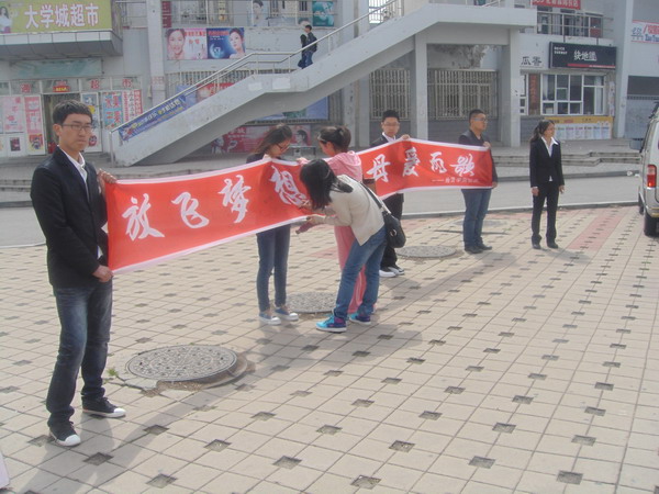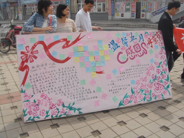 5月13日上午9时,经济学院团委信息技术部和编辑部所有成员在A区食堂门口集合并摆出母亲节宣传画板和条幅。此次活动以宣传母爱,感恩母亲为主题,号召在外学子们通过签字和粘贴祝福母亲,感怀母爱小寄语等方式表达对母亲的思念和祝福。