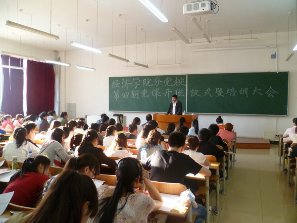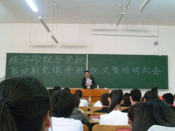 2012年5月17日下午5点,经济学院分党校第四期党课培训班开班仪式暨第一次党课培训在4207隆重召开。校党委宣传部部长李德学教授、经济学院党总支书记韩平教授、辅导员尚振华老师、兼职辅导员秦力昆老师出席了开班仪式。大会由沙靖宇老师主持。 仪式上,韩平书记对全体党课学员提出了希望及要求:第一,希望全体学员树立坚定的共产主义理想,端正入党动机。第二 ,希望全体学员充分认识到理论学习以及党课培训的重要性。最后,韩书记对入党积极分子的职责和任务作出了总结,希望入党积极分子能不断锤炼自身素质、起模范带头作用,早日加入中国共产党。