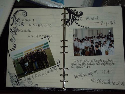编写班务日志习惯的养成开始于08级同学入学之初,现已延伸至09级和10级,旨在以班务日志的形式将同学们大学四年的点点滴滴记录并珍藏下来,成为班级每个人成长的见证。它主要记载着同学们从入学伊始的军训生活到后来四年的班团活、班会、各种班级组织的活动以及参加校院各种活动中班级所有成员共同参与的过程及感想,它也记录着部分同学的学习心得、人生感悟,同时也穿插着一些同学们认为很有纪念价值的散文和各种有学习价值的手抄报。每个班的班务日志的形式都各有特色,不拘一格,内容丰富多彩,把所有共同成长的宝贵瞬间化为永恒,见证了每一位同学从单一的个体变成共同成长的团体中的一员的心路历程,也见证着每个班级走向成熟的过程。在各班班委会的组织下,班务日志在同学们之间传阅着,在传阅中增进了同学们对班级以及同学之间的相互了解,使整个班级有了更高的凝聚力,使整个班级得到了更健康快速的发展。