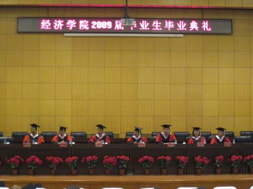 2009年6月18日早8:30,经济学院2009届毕业典礼在专家公寓国际报告厅隆重举行。毕业典礼由孟宪弢老师主持,经济学院党总支书记韩平副教授,副院长郭振教授、王涛教授、项义军副教授、政治经济学教研室主任张型双老师、经济学教研室主任张英教授、统计学教研室副主任韩晓老师、国贸教研室李娟老师以及2009届毕业生、部分毕业生家长参加了本次典礼。