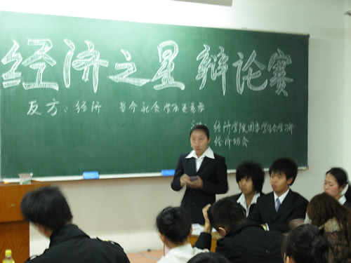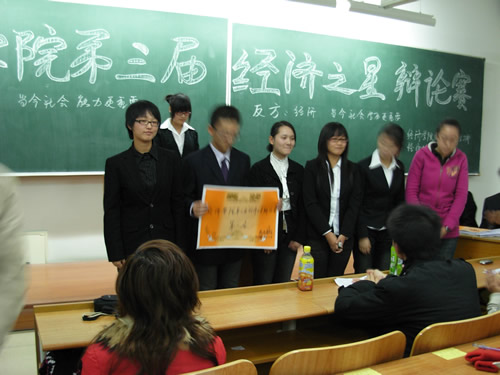 2008年11月13日晚5:30,经济学院第三届经济之星辩论赛决赛在3407教室拉开帷幕,本届辩论赛由经济学院院团委学生会学习部主办,校经济协会承办,院学生会主席于剑飞,团委副主任刘建国等学生干部担任评委,辩论会现场气氛热烈,掌声不断。