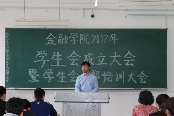 4月24日16:20,金融学院于0704教室召开了新一届院团委学生会成立大会暨学生会干部培训大会。金融学院党委书记钱雨春、副书记王春华、15级辅导员董兵权、16级辅导员罗楠老师及新一届院团委学生会干部出席大会。本次大会由董兵权老师主持。