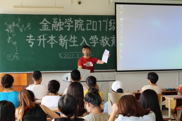 2017年8月20日下午15:00,金融学院在A区主楼0704室举行了2017年专升本新生入学教育大会。金融学院党委书记钱雨春、科研副院长陈敏、金融学教研室主任王春宇、辅导员董兵权出席大会。