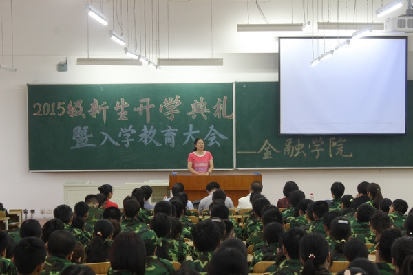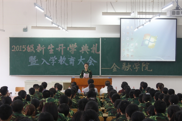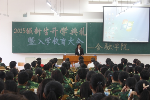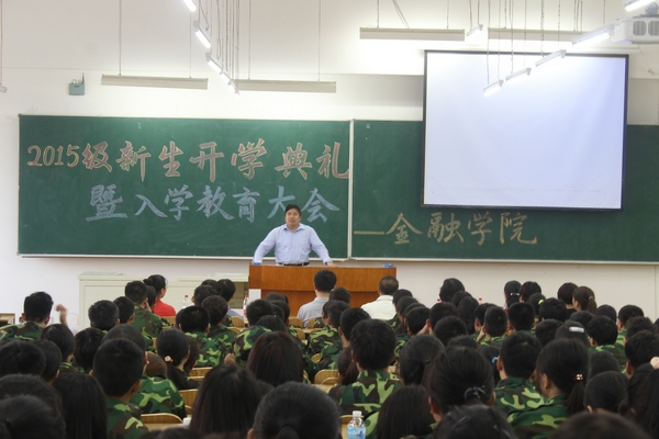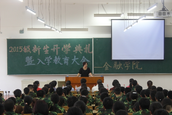 8月30日下午17时,金融学院在4206教室隆重举行了2015级新生开学典礼暨入学教育大会。金融学院院长李国义、党总支书记钱雨春、科研副院长陈敏、党总支副书记王春华、金融学教研室主任刘降斌、投资学教研室主任庞海峰、任课教师韩阳、15级辅导员董兵权及全体新生出席了大会。大会由王春华副书记主持。