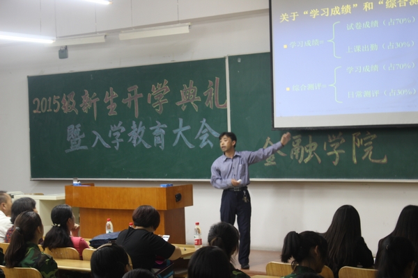 接下来李国义院长向新同学作了专业思想教育。李院长首先用翔实的案例向新生讲述了商业和金融的关系,详细介绍了学院的发展简史、办学特色、教学与实践优势、社会优势、品牌优势及学生就业率情况,鼓励新同学树立新目标,实现新梦想。