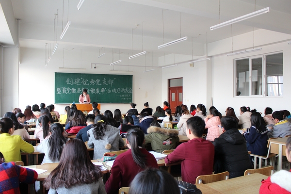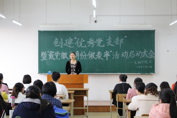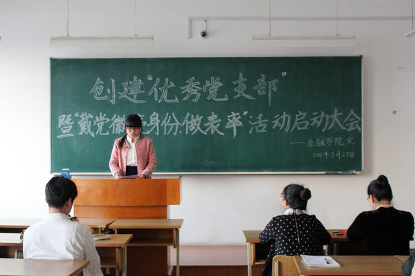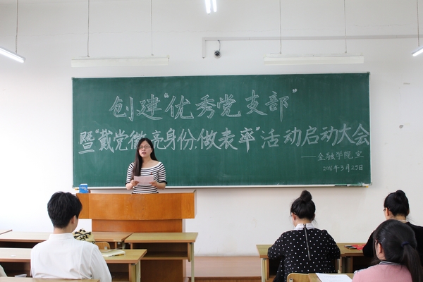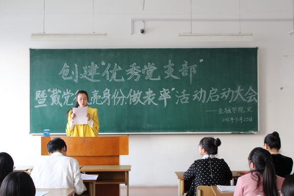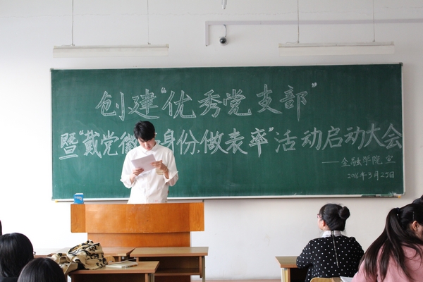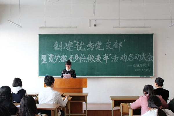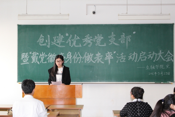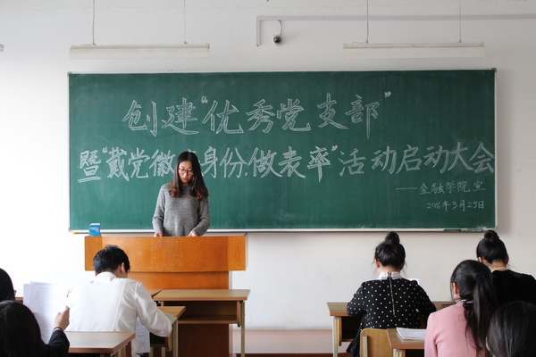 2016年3月25日下午,金融学院在0721教室召开了创建“百优党支部”暨党员“戴党徽、亮身份、做表率”活动启动大会。会议由学生党支部书记崔敏同学主持,院党总支副书记王春华老师及2013级、2014级全体学生党员参加了会议。