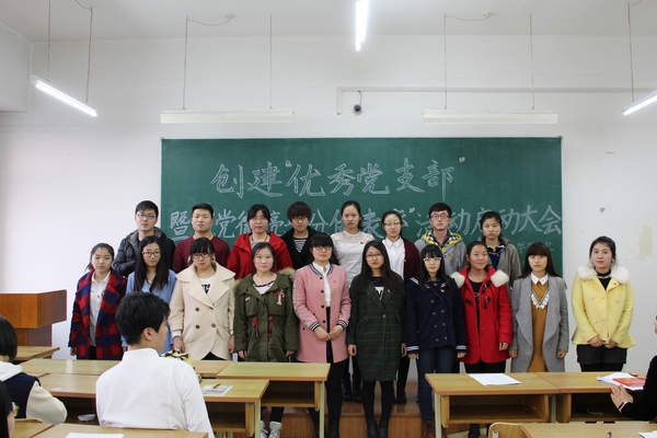 接下来,由各学生党支部书记分别发言,介绍创建“百优党支部”的活动方案,各支部都积极地表达了争先创优的决心,希望能够起到表率作用。随后,“戴党徽,亮身份,做表率”活动启动仪式开始,学生党员统一将党徽佩戴在外衣左胸中间,表明自己光荣的党员身份。学生党员代表韩佩秀同学进行了发言,代表全体学生党员郑重承诺,在学习和工作中要增强先模意识、自律意识,充分发挥学生党员的先锋模范作用,在创优活动中做出新贡献。