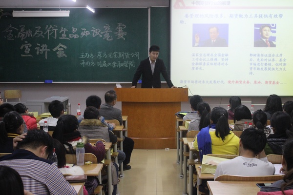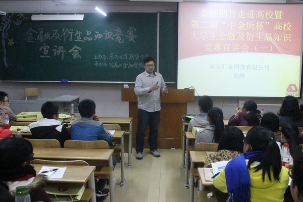 11月12日17:00,由东方汇金期货公司主办、我校金融学院承办的第二届“中金所杯”高校大学生金融及衍生品知识竞赛宣讲会在主楼0724教室火热进行。会议由金融学院庞海峰教授主持,全场座无虚席。