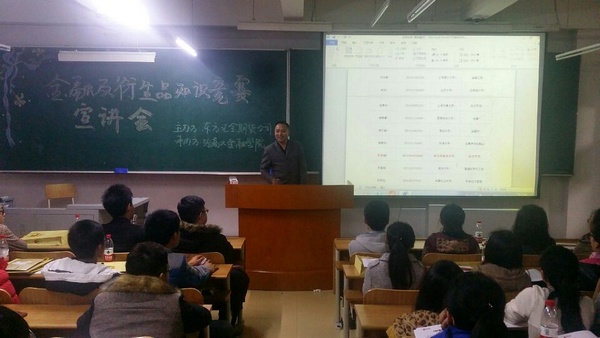 在东方汇金期货公司就业的金融学院毕业生朱峰用诙谐幽默的语言开启了此次知识竞赛的宣讲。详细介绍了金融衍生品和股指期货的知识,朱峰学长最后的例题分析更使参赛者明确了竞赛内容及难度,让同学们对竞赛有了志在必得的决心。