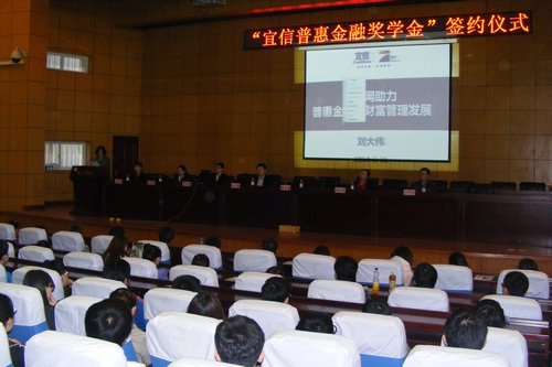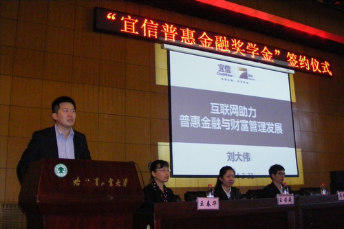3月31日下午2点,金融学院与宜信惠民投资管理(北京)有限公司在我校专家公寓一楼国际会议厅隆重举行“宜信普惠金融奖学金”签约仪式。宜信惠民投资管理(北京)有限公司总裁助理刘大伟先生、信用管理中心高级经理马斌斌先生和信用管理中心主管王茜薇女士、金融学院党总支钱雨春书记、副院长温红梅、金融学教研室主任刘降斌、团委书记石亚平、11级辅导员董兵权、13级辅导员何开文及各年级学生300余人出席了签约仪式,签约仪式由党总支王春华副书记主持。