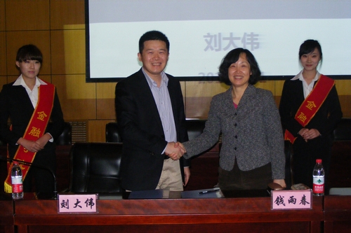 会上,钱雨春书记和刘大伟先生先后致辞,随后举行了隆重的签约仪式,刘大伟先生与钱雨春书记代表双方在协议书上签字,双方合影留念。接下来,刘大伟先生向在场的同学们作了专题讲座,讲座结合宜信公司的业务发展情况,阐述了网络金融当前的发展趋势,详细介绍了宜信公司的人才需求状况。讲座使同学们深刻认识到提升个人综合素质的重要性,以适应未来工作的需要。最后,校友马斌斌走上台,热情洋溢、娓娓道来,与在座的同学们分享了自己多年来可贵的工作经验,值得同学们借鉴和学习。在场的同学们还结合自己所学的知识,就自己关心的内容纷纷向马斌斌学长提出问题,马斌斌成熟、睿智、富有指导意义的精妙解答赢得了台下师生们一次次热烈的掌声。