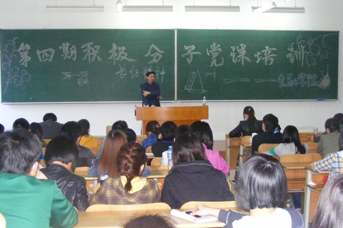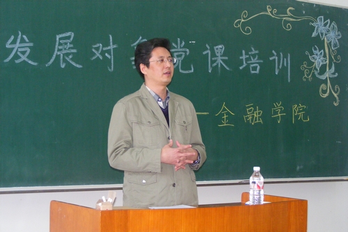 5月8日17:30,在4101教室举行了党课培训班开学典礼,并进行了第一次党课培训,典礼仪式由2011级辅导员董兵权老师主持。在开学典礼上,金融学院党总支书记钱雨春发表了重要讲话,强调同学们要树立正确的世界观、人生观和价值观,端正入党动机,认真学习党的理论体系,树立共产主义信念,保持思想进步、政治坚定,提高思想觉悟和认识水平,不仅在思想上,更要在行动上努力成为一名学生党员。2011级拟发展对象张楷同学代表全体参加本次培训的入党积极分子和拟发展对象发言。表示作为一名思想积极要求进步的学生,一定要以此次培训为契机,努力学习党的历史知识,打下坚实的理论基础,树立远大理想,发扬党的优良传统,以实际行动争取早日入党。