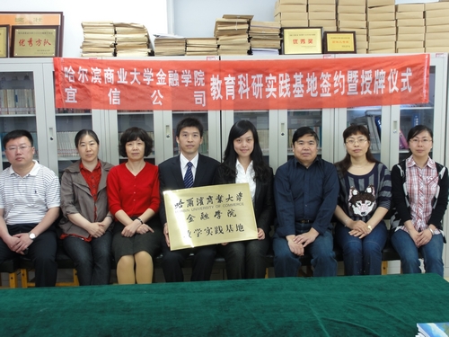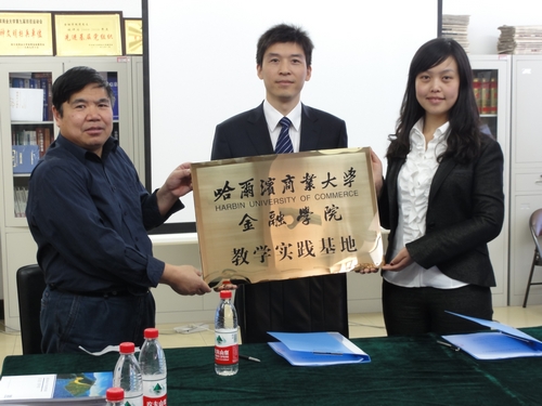 2012年5月18日,金融学院与宜信惠民投资管理(北京)公司在哈尔滨商业大学金融学院资料室举行“教育科研实践基地暨授牌仪式”,校方代表金融学院院长李国义与企业方代表宜信惠民投资管理(北京)公司负责校企合作的高级经理金晓磊在“校企共建实习见习基地协议书”上签字,之后举行授牌仪式,“哈尔滨商业大学金融学院教学实践基地”的牌子将挂在宜信公司醒目之处。双方签约目的为:密切校企合作,建立长期稳定的哈尔滨商业大学毕业生校外实习见习基地,构建适应企业发展需求的人才输送渠道。