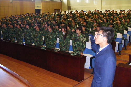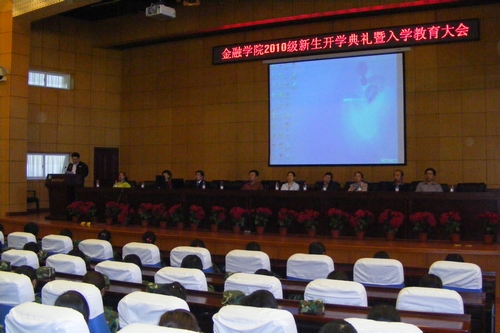 9月16日下午1:30,正在军训的金融学院2010级全体新生280人在导生的带领下,身穿军训迷彩服整齐地步入专家公寓一楼国际会议厅,2010级新生开学典礼暨入学教育大会在此隆重举行。
