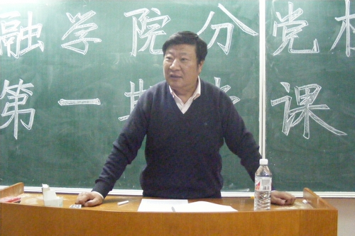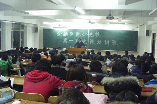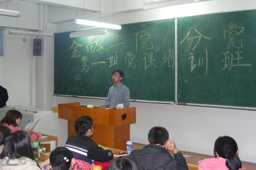 随后,培训班进行了第一次党课学习,由李院长主讲,内容为“如何理解共产主义理想”,李院长亲切、隽永的话语深深影响了在场的同学,为同学们上了生动的一课。在接下来的一周内,金融学院邀请了我校宣传部李德学部长和马克思主义学院徐业滨教授分别讲了两次党课,就科学发展观的内涵和中国共产党的光辉历程向同学们进行了系统阐述。金融学院董兵权老师讲授了中国共产党的最高理想和奋斗目标,使学生更加了解了党的性质,党的最高理想和最终目标,党的指导思想,党的宗旨等相关知识。