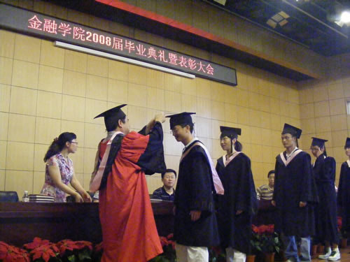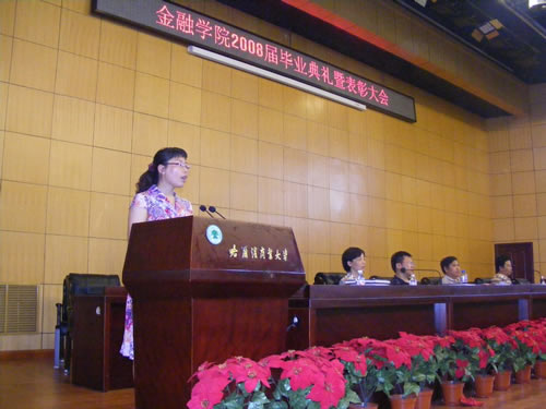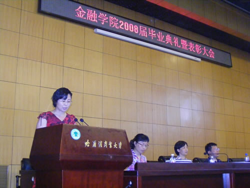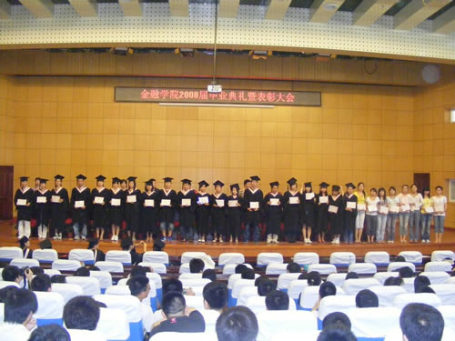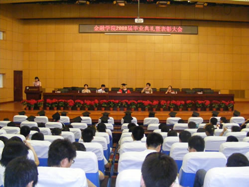 历经四年勤学苦,又到一年毕业时。6月29日下午13:30,金融学院2008届毕业典礼暨表彰大会在我校新区专家公寓一楼国际会议厅隆重举行。金融学院院长李国义教授、党总支副书记钱雨春副教授、副院长姚凤阁教授、金融学教研室主任刘降斌副教授、金融工程教研室主任温红梅副教授出席了大会,典礼大会由2008届毕业生辅导员、院团委书记王春华老师主持,2008届全体毕业生参加了大会。