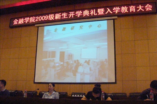 8月30日,即迎新生的第三天,下午17:00,金融学院2009级全体本科新生240多人在导生的带领下,身穿军训迷彩服整齐地步入专家公寓一楼国际会议厅,2009级新生开学典礼暨入学教育大会在此隆重举行。