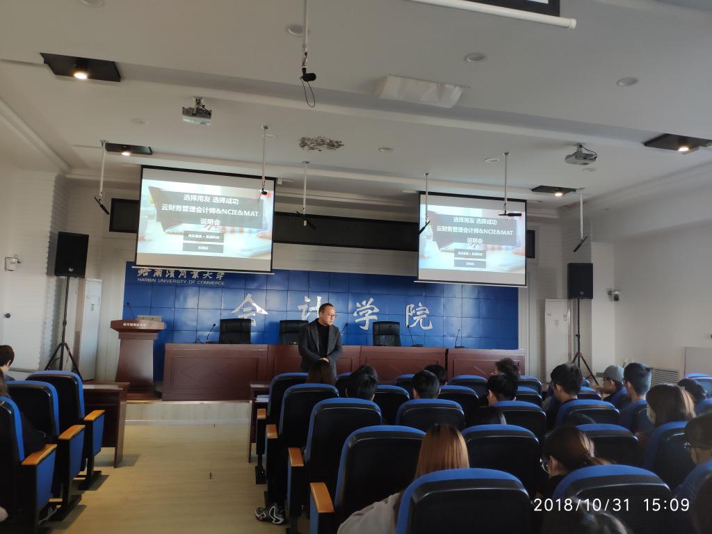2018年10月31日13:30,会计学院邀请了新道科技黑龙江区总经理张海冰先生为2016级会计学专业学生进行了一场题为《选择用友,选择成功——云财务管理会计师&NCIE&MAT》的说明会,说明会由徐鹿副院长主持。