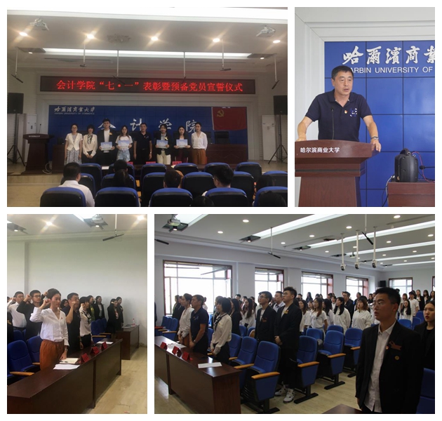 会上宣读了会计学院2018-2019年度校级优秀共产党员和先进基层党组织名单,及会计学院2018-2019年度“党站之星”名单。传达学院党委关于批准预备党员的通知后,全体预备党员面向党旗,右手举拳,声音洪亮,庄严宣誓。随后,与会党员老师为预备党员佩戴党徽。