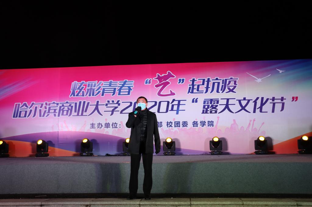 10月13日晚,哈尔滨商业大学2020年“露天文化节”会计学院迎新专场演出在愉悦的欢呼雀跃声中拉开序幕。会计学院党委书记张春明、院长张劲松、副院长徐鹿、副院长梁运吉、团委书记王博及全体辅导员参加活动。张春明上台致开场词,话语中充满了对2020级新生们的关心与鼓励,并祝愿2020级新生们在学习、事业、生活上都能有所收获。