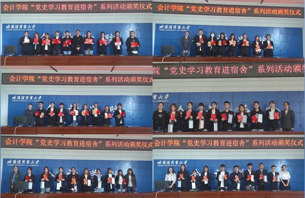 5月26日,会计学院在1501报告厅举行“党史学习教育进宿舍”系列活动颁奖仪式。会计学院党委书记张春明,团委书记白璐,团委副书记韩雪、奚迪,2017级辅导员李慧铭,2018级辅导员陆黎敏,2020级辅导员张涵、姜译涵,研究生辅导员李修茹参加会议。