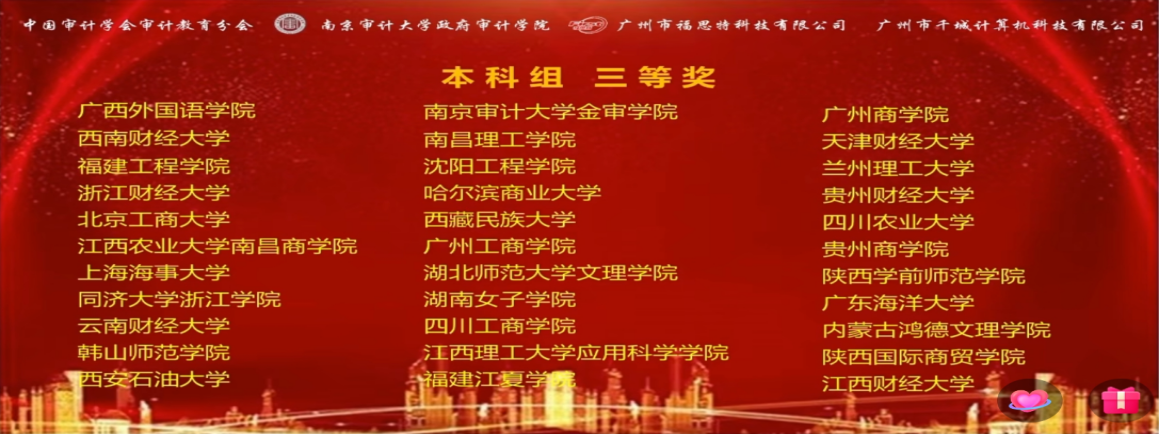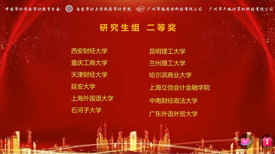 大赛通过线上直播方式举行,会计学院审计教研室教师姜玲玲、王宇慧、林笑楠带领的一支研究生组队伍和一支本科组队伍参加大赛。大赛上午9时开始,历经2个小时40分钟,经过审计职业素养与审计专业能力、案例分析两个阶段的激烈角逐后,我校两支队伍分别获得全国研究生组二等奖、本科组三等奖。