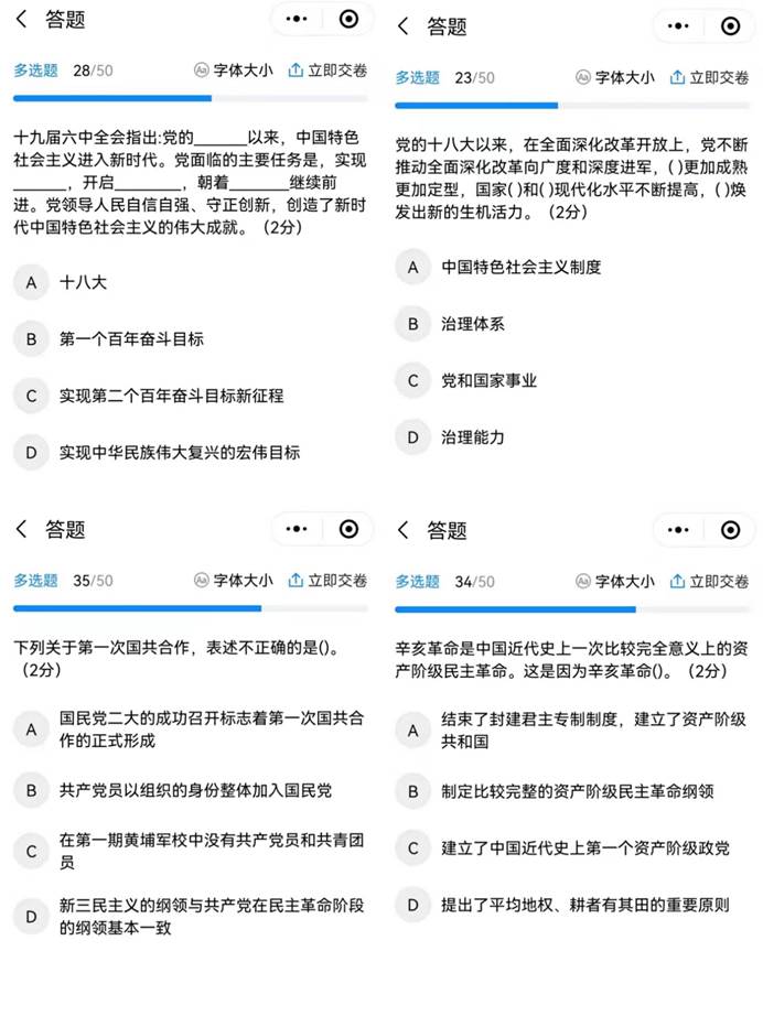 竞赛采用线上答题模式,内容涵盖十九届六中全会和2022年全国两会精神,以及党的初心使命、光辉历程、伟大精神、宝贵经验、创新理论等。比赛题型包括单选、多选和判断,限时25分钟之内完成。通过系统随机抽题,保证公平公正公开,学院以参赛者的答题成绩、答题用时作为评奖依据,最终评选出优秀参赛个人和支部(班级)。本次学习知识竞赛检验了学院党的理论学习教育的阶段性成效,以赛促学,以学促知,调动了学院学生的学习积极性,推动了党史学习教育走深走实。