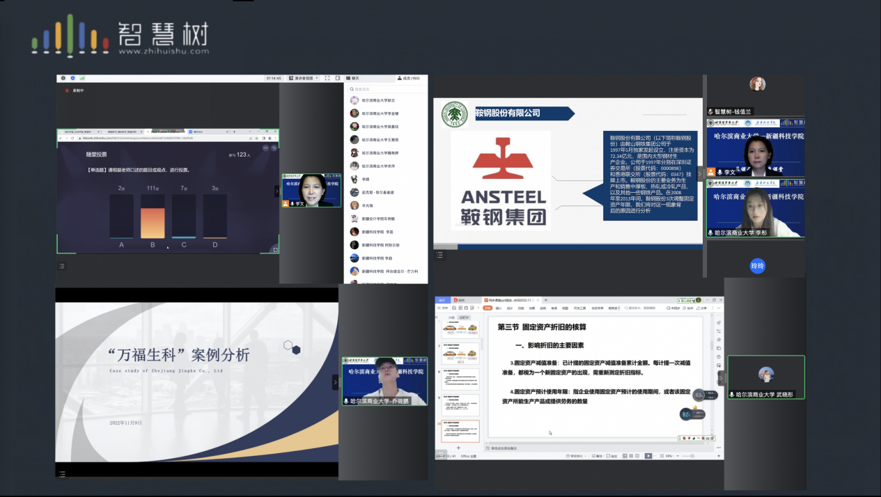 我校《会计学》课程是黑龙江省一流本科课程,李文教授是《会计学》课程负责人,本次课程李老师借助智慧树翻转课平台进行线上直播授课,课程内容是讲授固定资产折旧,具体包括影响折旧的主要因素、范围、方法、账务处理等内容。为了上好同步课堂,让学生在新模式下收获更多,李老师针对同步直播课程特点,对教学内容进行了认真地梳理和打磨,注重每个要点的知识性、趣味性以及知识点间的融会贯通,并将《马克思恩格斯全集》中马克思关于固定资产折旧原理贯穿课程授课始终。课堂上,李老师将课程与实际相联系,将抽象化的理论知识具象化,组织学生对万福生科开展小组案例讨论,结合课程思政讲解鞍钢案例,启迪学生坚守职业道德,提高学生分析和解决问题的能力。授课过程中,借助智慧树平台的投票、抢答、头脑风暴等工具辅助课堂教学,两校师生积极进行“云互动”。