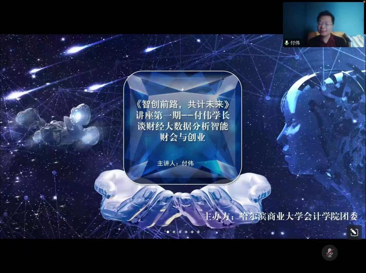 为增强学生对财经大数据分析和智能财会的前沿学科知识的理解、明确对未来职业的规划,由会计学院校友会主办的“智创前路,共计未来”讲座第一期于近日在线上举行,校友会特邀2003级财务管理专业毕业生付伟为学院师生开展了以”财经大数据分析智能会计与创业”为主题的讲座。会计学院王明炜主持会议。