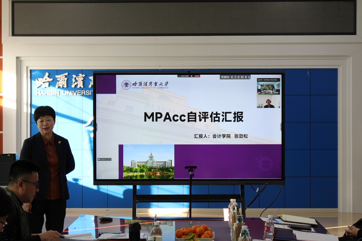 哈尔滨商业大学会计学院会计硕士学位点带头人张劲松教授从培养目标及特色、培养环境、培养过程、服务贡献四个方面向评估专家组汇报了会计硕士学位授权点的基本情况和发展历程。