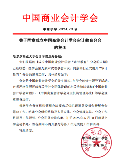 2024年12月30日,成立“中国商业会计学会审计教育分会”(以下简称审计教育分会)的申请经中国商业会计学会第九届六次理事会审议通过,我校会计学院作为核心发起人设立的全国性审计教育交流平台正式成立,这将进一步提升我校审计专业影响力。