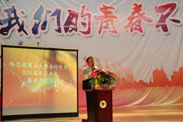 在校生代表、会计学院学生会主席王超也进行了发言。他代表在校生主动向优秀的师哥师姐学习,从而更加完善自我。同时也对2016届毕业生送上了美好的祝福,祝愿他们能梦想成真、一路顺风。在两位学生代表发言后,我院对所有优秀学生进行了颁奖。在庄严与热烈的气氛中2016届获奖学生逐一上台领奖,从曾经辛勤培育过他们的老师的手中接过证书与礼品,并与老师热情拥抱。