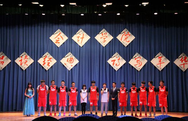 上半场结束后,会计学院篮球队队员进行了团队及个人介绍,向我们诠释了奋发向上、积极拼搏、团结一致的篮球精神。陈惠华和刘天还穿上了队员们精心准备的战袍,表示要与篮球队员们一起为会计学院战斗,不断为会计学院取得荣光。