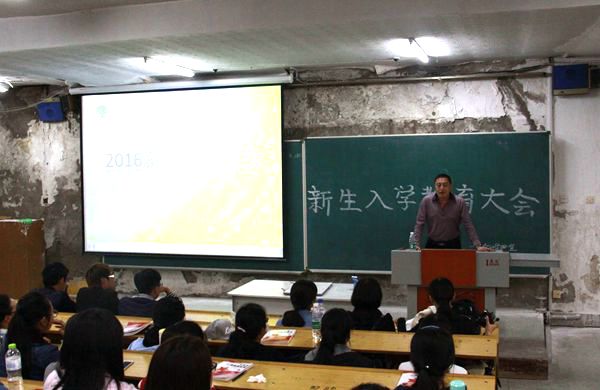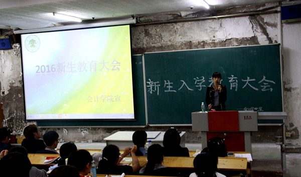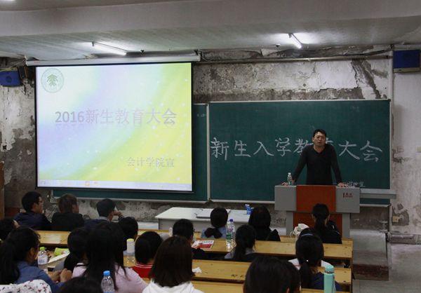2016年9月19日下午5点,哈尔滨商业大学会计学院2016级新生入学教育大会在C区西121教室举行。会计学院党总支书记张春明副教授,党总支副书记刘天副教授,团委书记、2016级辅导员王博老师以及会计学院2016级的导生和全体新生参加了此次会议。会议由王博老师主持。