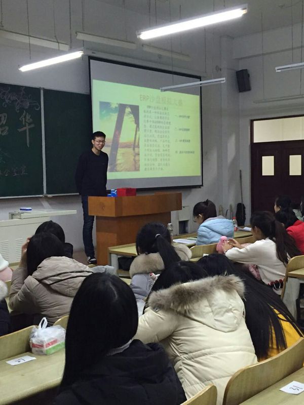 首先,曾参加过挑战杯,管理决策模拟大赛,大学生创业计划网络虚拟运营大赛等多项国家级比赛,并多次获得校级单项奖学金的牛人陈家俊向我们依次分享了何为“挑战杯”,如何参赛及他的比赛经验,接着又向同学们介绍了“数学建模”和“ERP沙盘”的基础理念,解题方法及比赛经验,紧紧结合自己的亲身体会,向同学们展示出了不一样的精彩,获得了大家热烈的掌声,效果甚佳。