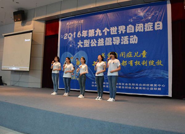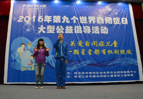 本次公益倡导活动,请来了黑龙江省孤独症研究协会会长、哈尔滨医科大学儿童发育中心主任武丽洁教授为我们进行专业的知识讲座,在自闭症儿童逐渐增多、重视自闭症儿童早期筛查诊断和科学干预治疗方面做了明确的讲解,为自闭症孩子家长、老师和志愿者们的问题进行了详细的解答。随后,一位小朋友献上了一曲《隐形的翅膀》,鼓励自闭症儿童克服困难,早日康复。刚一结束,志愿者就将一个大蛋糕推上了舞台,蕴藏了美好的祝愿。紧接着,自闭症中心的一群90后老师们为我们带来了《大王叫我来巡山》,孩子们看到老师表演节目兴奋不已,手舞足蹈的为老师打气。但是最感人的节目还要属由自闭症儿童演唱歌曲《感恩的心》,他的音调并不准确,他的动作并不优美,但他的感情却最为炽热。在他表演的过程中我们可以看到很多家长及老师眼眶里的泪水。