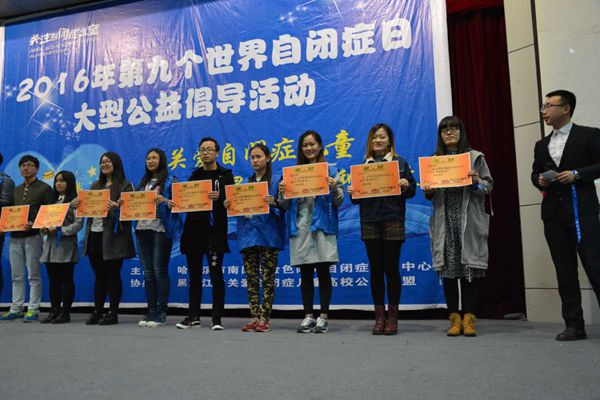 本次公益倡导活动是由金色阳光自闭症康复中心主办,黑龙江省关爱自闭症儿童高校公益联盟协办,活动当天,有近30个高校志愿服务队参与倡导活动,400多名志愿者身穿蓝色马甲,手系蓝丝带,为自闭症孩子打造一片蔚蓝的世界。我校四名干事还纷纷穿上了白裙,征集大家写给自闭症儿童的一句话。