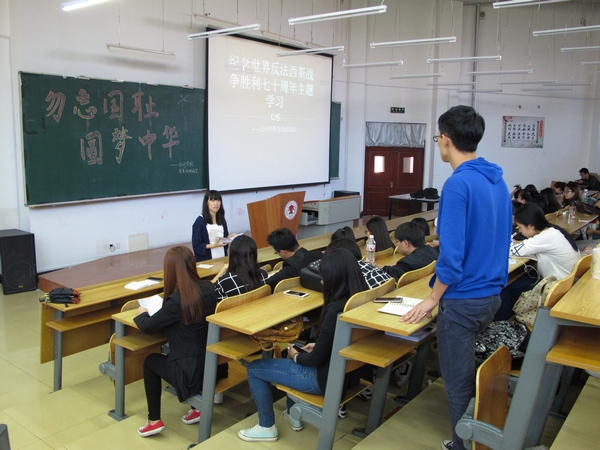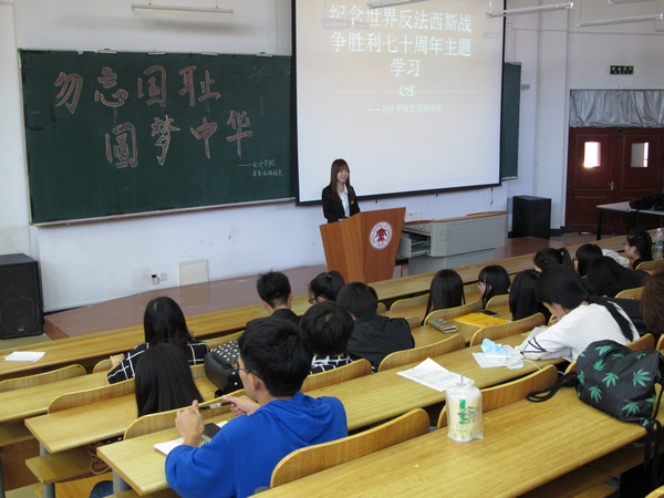 铭记历史,逐梦华夏,在全世界反法西斯战争胜利七十周年之际,会计学院学生党员活动站于9月1日晚4点30分在4211教室开展了以“勿忘国耻,圆梦中华”为主题政治理论学习。参加此次学习活动的有会计学院党总支副书记刘天老师、会计学院2013、2014级学生党员。