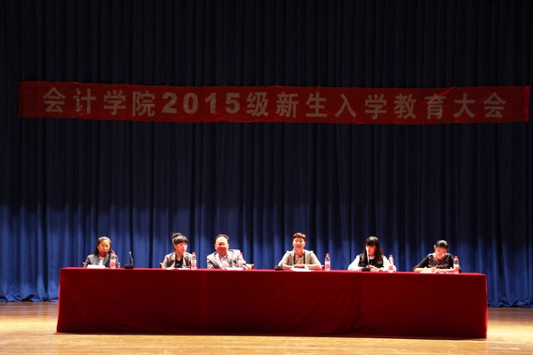 9月11日19点30分,哈尔滨商业大学会计学院2015级新生入学教育大会于B区大礼堂隆重举行。莅临本次大会的领导有:会计学院党总支书记陈慧华教授、院长张林教授、副院长张劲松教授、副院长徐鹿教授、党总支副书记刘天副教授、2015级辅导员白璐老师。到场的还有会计学院2015级的导生和全体新生。