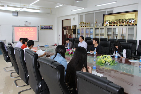 首先,会计学院为两家公司准备学院精美的宣传画册,张林院长介绍了学院的基本情况。他主要从以下几个方面来谈,学院的沿革发展、师资队伍建设、学科建设与研究生教育、特色教学和学生工作。在介绍中,他重点谈到了会计学院国际化程度较高的办学特色,国际化教育是会计学院的品牌、特色。目前,合作院校数量增加,学生出国留学数量增长迅速。已将国际合作项目延伸到研究生层次和非合作办学专业。学院计划将所有的35岁以下青年教师都派往国外和台湾进行学习,培养教师双语教学能力。在谈到双方合作的问题上时,张院长说,会计学院学生连续六年在“新道用友杯”ERP沙盘大赛中取得国家级大奖,是双方合作双赢的重要标志。