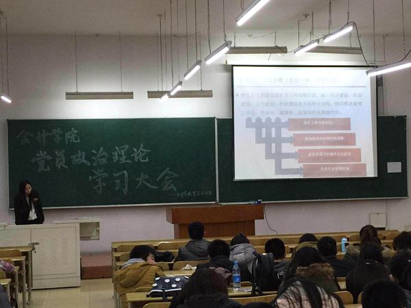 第二,全体学习十八届五中全会的会议内容。主持人通过PPT为学生党员清晰、生动的介绍了会议内容。作为十八届五中全会的主要议题——“十三五”规划即将在2020年收官,这份计划是否能够如期实现和即将做出的安排成为此次议会的焦点。此次学习十八届五中全会的内容旨在让大学生党员能够进一步了解中国国情和国家发展状况以及国家发展的未来目标,并能够以此为目标刻苦学习专业知识,脚踏实地。主持人讲解之后向在座的同学提问有何感受,王理想同学发言说到大学生是国家栋梁,我们要发挥自身的优势和作用成为社会正能量的带头人。郭丰池同学说,我们即将走向工作岗位,要对未来有规划,学习了此次精神,决心努力为党的光辉事业贡献自己的力量。同学们发言后,刘天老师向全体学生党员布置学习《条例》、《准则》的学习任务。