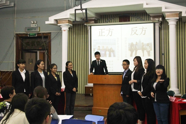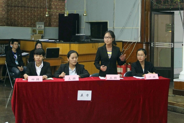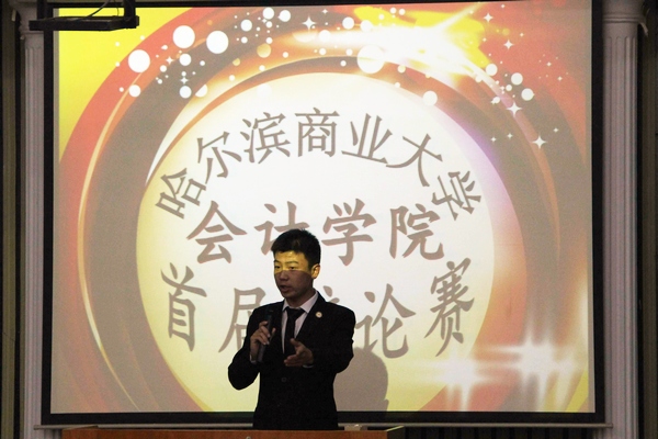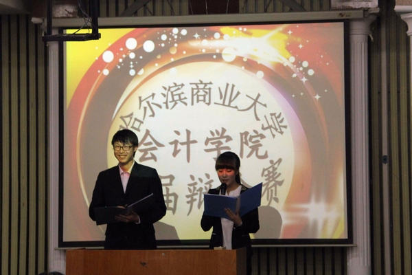 为了提高学生综合素质,丰富课余生活,培养全面发展的人才,2015年5月26日17时,哈尔滨商业大学会计学院首届辩论赛于B区多功能厅隆重举行。此次活动由会计学院学生会主办,学生会外联部承办。莅临此次活动现场的评委和嘉宾有会计学院党总支书记陈慧华教授、2013级辅导员李慧铭老师、2014级辅导员陆黎敏老师、奚迪老师及学生会主席团成员。