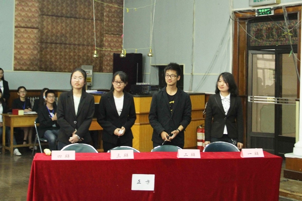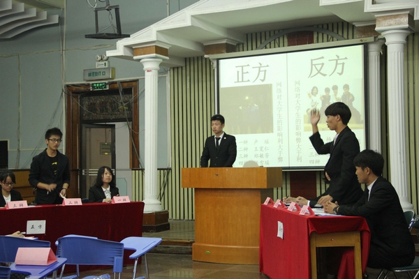 此次辩论赛分为半决赛和决赛两部分,共确定了四组代表队。在两场半决赛中,他们思维灵便、表达出色、团结一心,为我们提供了一场场视觉、听觉盛宴。正反双方针对“网络对大学生的利弊”这一辩题展开了一场舌战,可谓针尖对麦芒。针锋相对、妙语连珠式的一问一答,精彩纷呈的正辩反论,“火药味”十足。而对于“对待大自然应以人为本还是以自然为本”这一辩题时,他们一方咄咄逼人、口若悬河,一方泰然自诺,滔滔不绝。双方各据一势,时有语惊四座,台下片片叫好之声,气氛空前。他们敏捷的思维、出色的表达,给大家留下了深刻的印象。经过激烈的角逐,“有一个队”和“言直爆表队”以出彩的表现获得了评委们的青睐,得以进入总决赛,争夺冠军宝座。