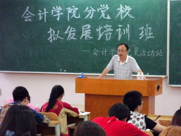 拟发展党课于5月28日、6月2日在4305教室开展。此次培训的授课教师有:、管理学院党总支书记谭士元教授、法学院党总支书记赵国军教授。参加此次培训班的同学为会计学院全体拟发展党员。